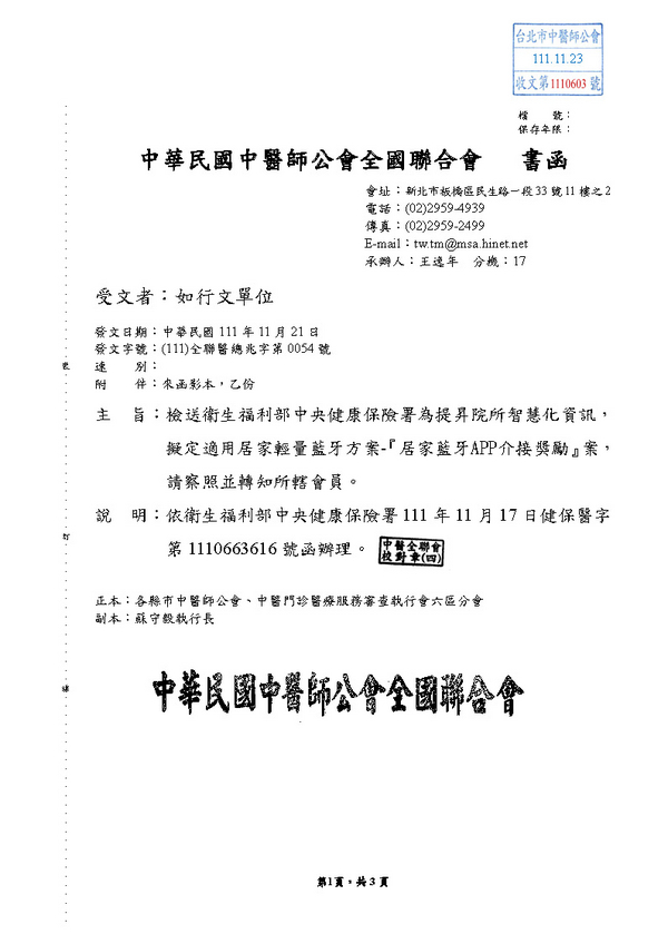 | 台北市中醫師公會 官網:http://www.tpcma.org.tw 地址:台北市中正區青島西路11號3樓 E-mail:tp.cma@msa.hinet.net 電話:(02)2314-3456(代表號) 傳真:(02)2314-8181 |