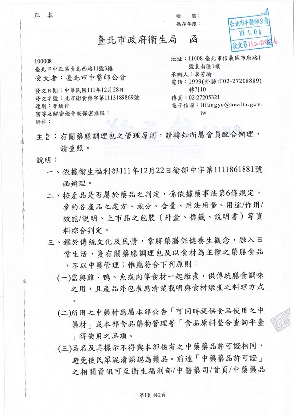 | 台北市中醫師公會 官網:http://www.tpcma.org.tw 地址:台北市中正區青島西路11號3樓 E-mail:tp.cma@msa.hinet.net 電話:(02)2314-3456(代表號) 傳真:(02)2314-8181 |