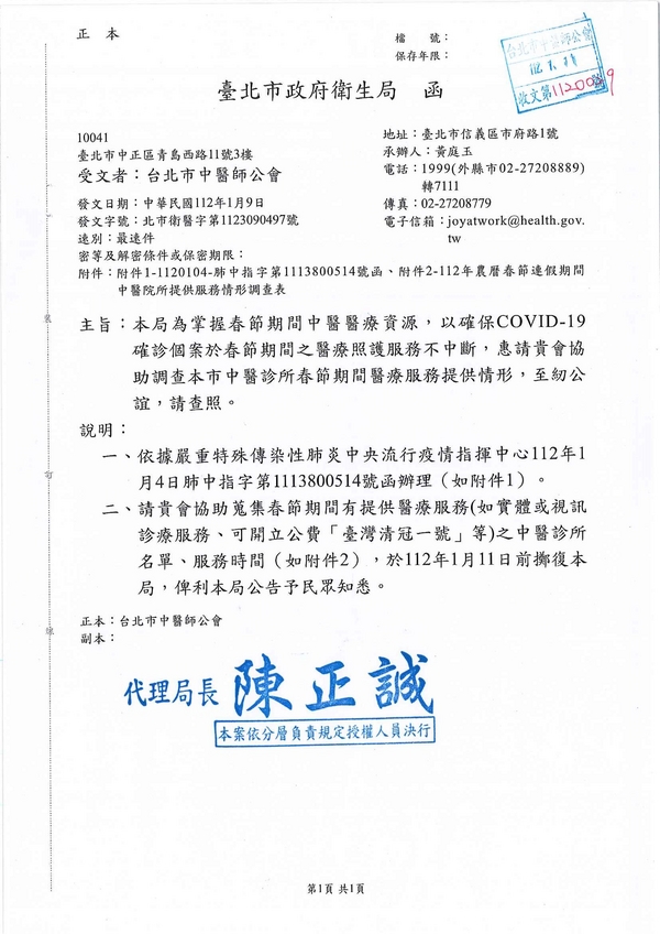 | 台北市中醫師公會 官網:http://www.tpcma.org.tw 地址:台北市中正區青島西路11號3樓 E-mail:tp.cma@msa.hinet.net 電話:(02)2314-3456(代表號) 傳真:(02)2314-8181 |