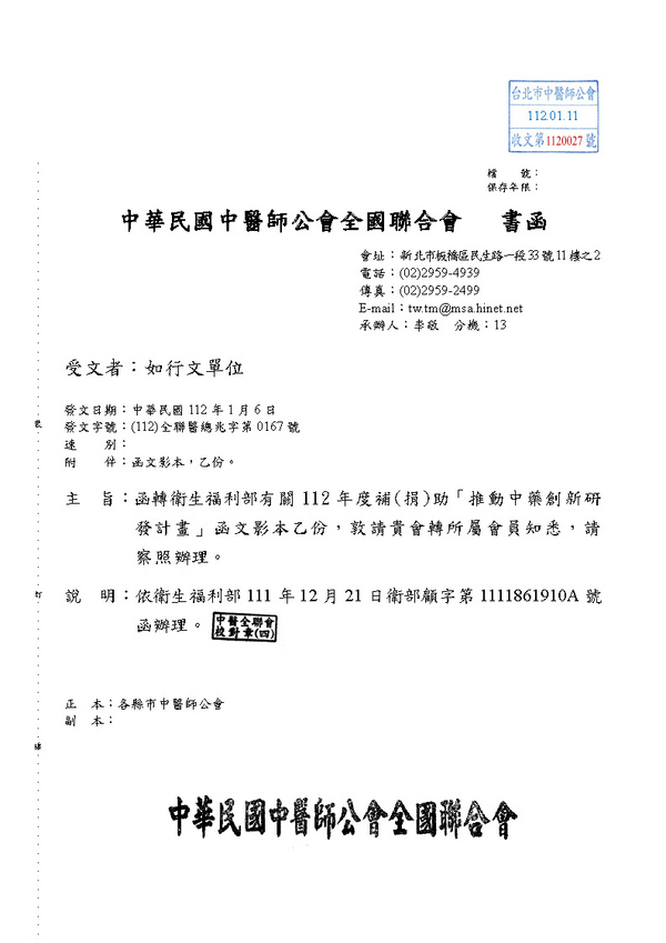 | 台北市中醫師公會 官網:http://www.tpcma.org.tw 地址:台北市中正區青島西路11號3樓 E-mail:tp.cma@msa.hinet.net 電話:(02)2314-3456(代表號) 傳真:(02)2314-8181 |