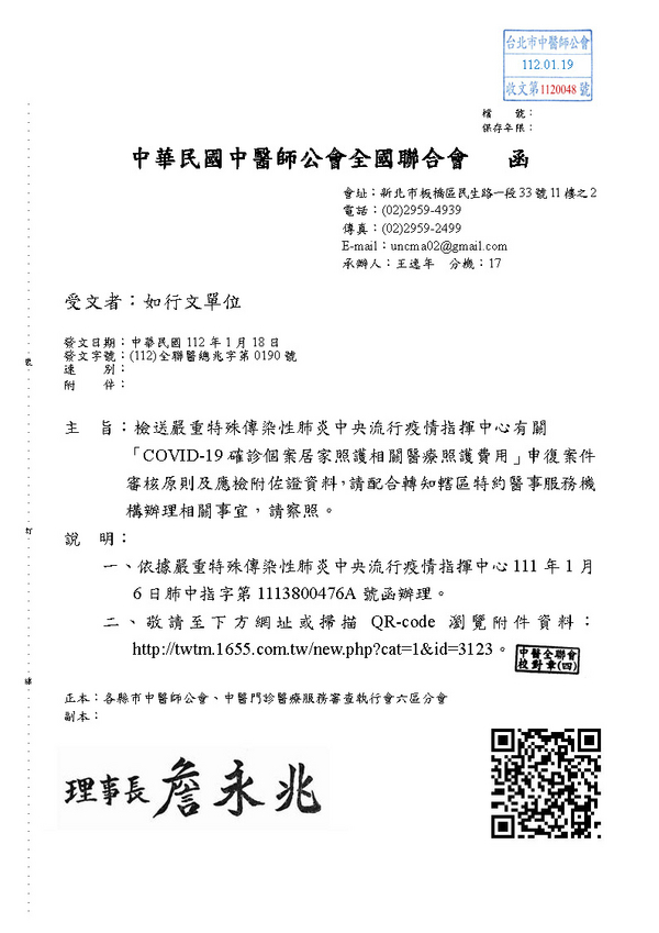 | 台北市中醫師公會 官網:http://www.tpcma.org.tw 地址:台北市中正區青島西路11號3樓 E-mail:tp.cma@msa.hinet.net 電話:(02)2314-3456(代表號) 傳真:(02)2314-8181 |
