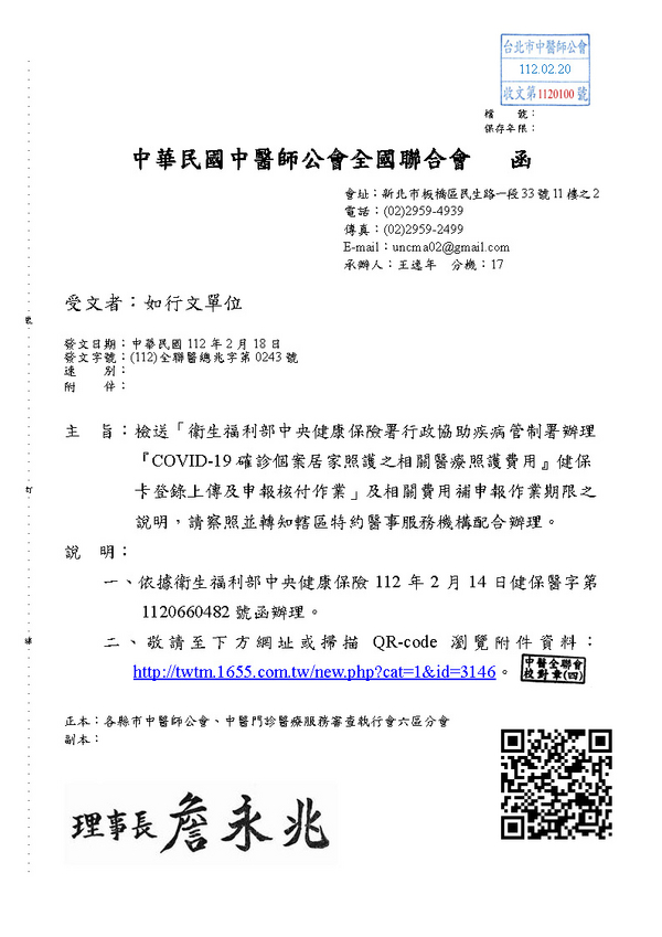 | 台北市中醫師公會 官網:http://www.tpcma.org.tw 地址:台北市中正區青島西路11號3樓 E-mail:tp.cma@msa.hinet.net 電話:(02)2314-3456(代表號) 傳真:(02)2314-8181 |