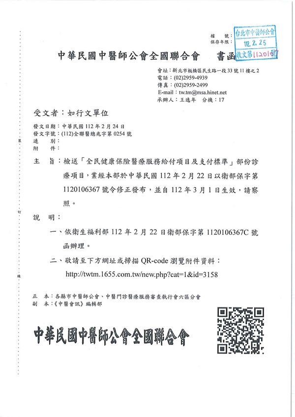 | 台北市中醫師公會 官網:http://www.tpcma.org.tw 地址:台北市中正區青島西路11號3樓 E-mail:tp.cma@msa.hinet.net 電話:(02)2314-3456(代表號) 傳真:(02)2314-8181 |