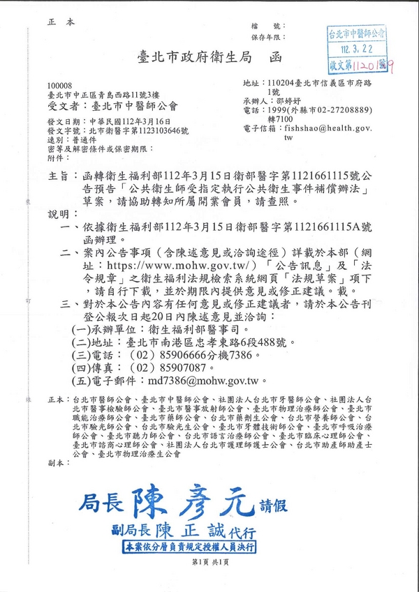 | 台北市中醫師公會 官網:http://www.tpcma.org.tw 地址:台北市中正區青島西路11號3樓 E-mail:tp.cma@msa.hinet.net 電話:(02)2314-3456(代表號) 傳真:(02)2314-8181 |