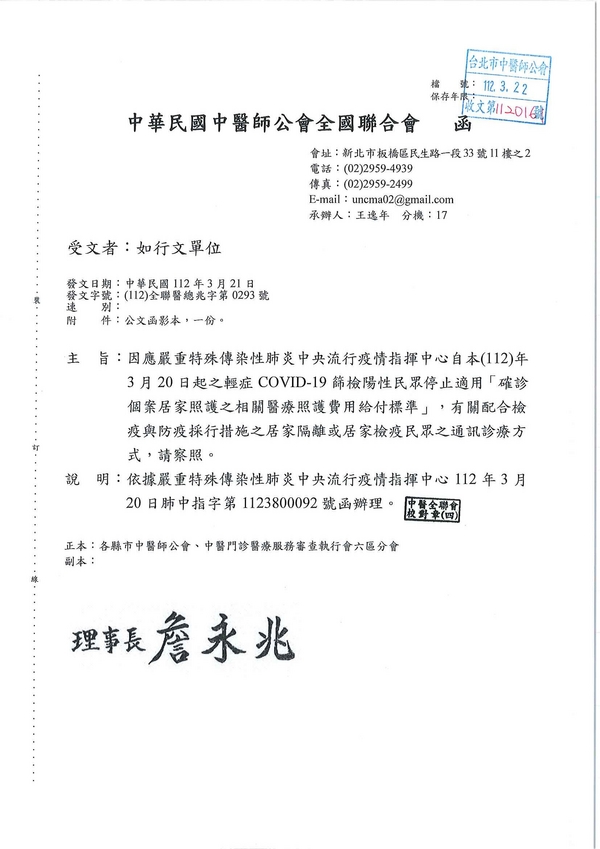 | 台北市中醫師公會 官網:http://www.tpcma.org.tw 地址:台北市中正區青島西路11號3樓 E-mail:tp.cma@msa.hinet.net 電話:(02)2314-3456(代表號) 傳真:(02)2314-8181 |