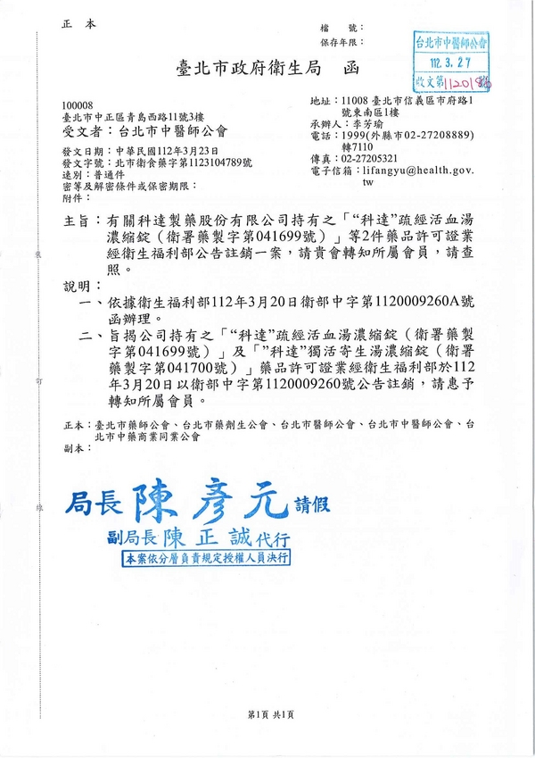 | 台北市中醫師公會 官網:http://www.tpcma.org.tw 地址:台北市中正區青島西路11號3樓 E-mail:tp.cma@msa.hinet.net 電話:(02)2314-3456(代表號) 傳真:(02)2314-8181 |