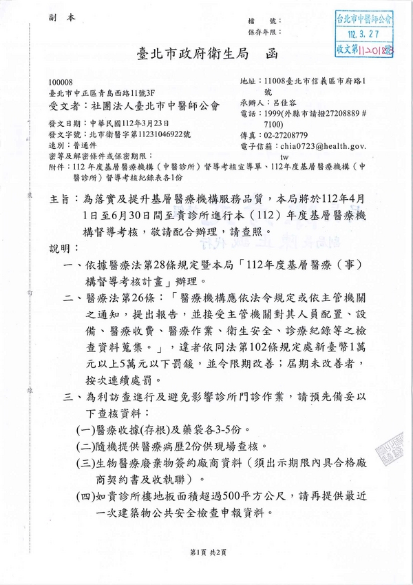 | 台北市中醫師公會 官網:http://www.tpcma.org.tw 地址:台北市中正區青島西路11號3樓 E-mail:tp.cma@msa.hinet.net 電話:(02)2314-3456(代表號) 傳真:(02)2314-8181 |