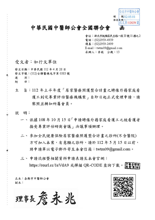 | 台北市中醫師公會 官網:http://www.tpcma.org.tw 地址:台北市中正區青島西路11號3樓 E-mail:tp.cma@msa.hinet.net 電話:(02)2314-3456(代表號) 傳真:(02)2314-8181 |