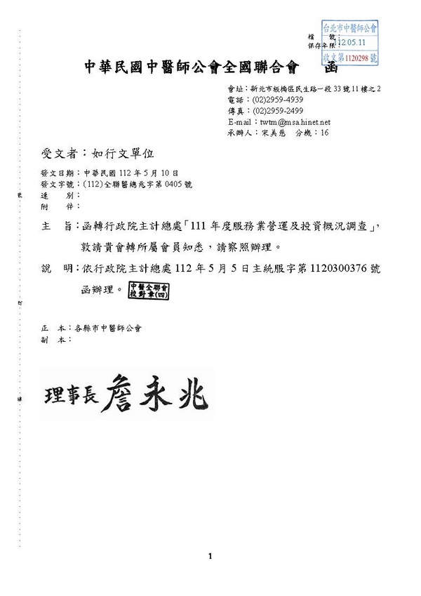 | 台北市中醫師公會 官網:http://www.tpcma.org.tw 地址:台北市中正區青島西路11號3樓 E-mail:tp.cma@msa.hinet.net 電話:(02)2314-3456(代表號) 傳真:(02)2314-8181 |