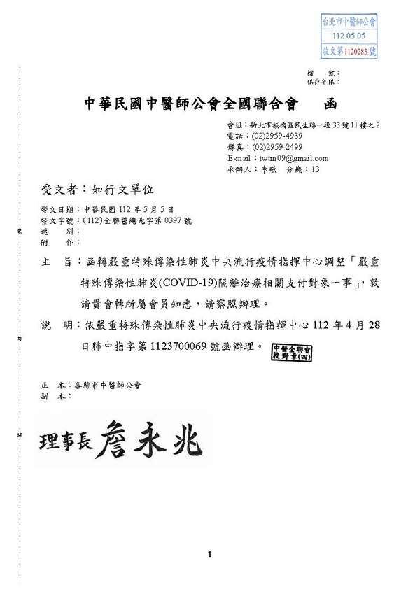 | 台北市中醫師公會 官網:http://www.tpcma.org.tw 地址:台北市中正區青島西路11號3樓 E-mail:tp.cma@msa.hinet.net 電話:(02)2314-3456(代表號) 傳真:(02)2314-8181 |