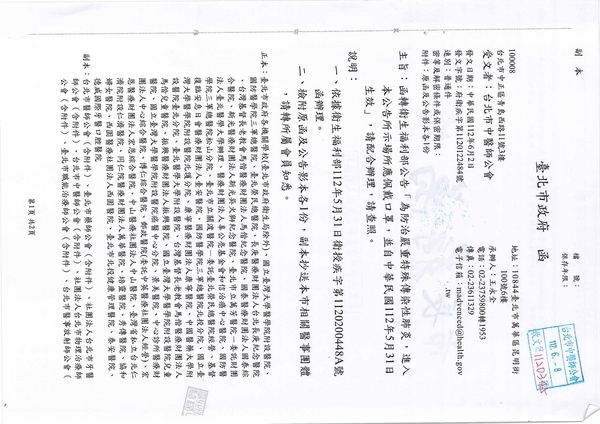 | 台北市中醫師公會 官網:http://www.tpcma.org.tw 地址:台北市中正區青島西路11號3樓 E-mail:tp.cma@msa.hinet.net 電話:(02)2314-3456(代表號) 傳真:(02)2314-8181 |