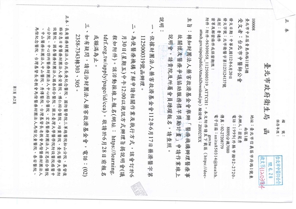 | 台北市中醫師公會 官網:http://www.tpcma.org.tw 地址:台北市中正區青島西路11號3樓 E-mail:tp.cma@msa.hinet.net 電話:(02)2314-3456(代表號) 傳真:(02)2314-8181 |