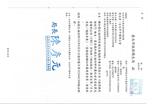 | 台北市中醫師公會 官網:http://www.tpcma.org.tw 地址:台北市中正區青島西路11號3樓 E-mail:tp.cma@msa.hinet.net 電話:(02)2314-3456(代表號) 傳真:(02)2314-8181 |
