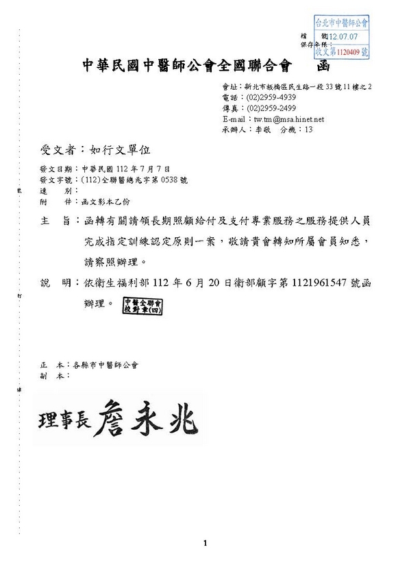 | 台北市中醫師公會 官網:http://www.tpcma.org.tw 地址:台北市中正區青島西路11號3樓 E-mail:tp.cma@msa.hinet.net 電話:(02)2314-3456(代表號) 傳真:(02)2314-8181 |