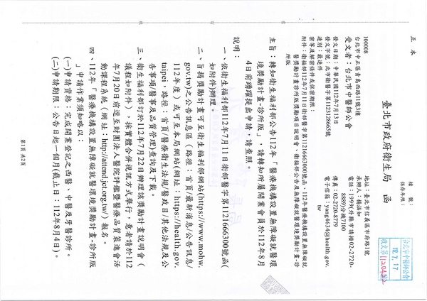 | 台北市中醫師公會 官網:http://www.tpcma.org.tw 地址:台北市中正區青島西路11號3樓 E-mail:tp.cma@msa.hinet.net 電話:(02)2314-3456(代表號) 傳真:(02)2314-8181 |