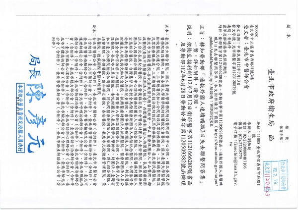 | 台北市中醫師公會 官網:http://www.tpcma.org.tw 地址:台北市中正區青島西路11號3樓 E-mail:tp.cma@msa.hinet.net 電話:(02)2314-3456(代表號) 傳真:(02)2314-8181 |