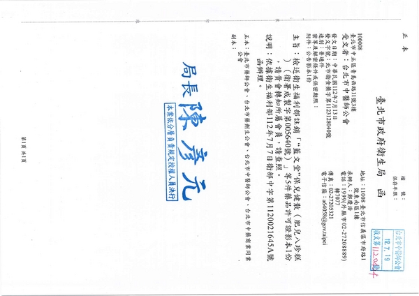 | 台北市中醫師公會 官網:http://www.tpcma.org.tw 地址:台北市中正區青島西路11號3樓 E-mail:tp.cma@msa.hinet.net 電話:(02)2314-3456(代表號) 傳真:(02)2314-8181 |