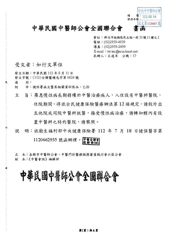 | 台北市中醫師公會 官網:http://www.tpcma.org.tw 地址:台北市中正區青島西路11號3樓 E-mail:tp.cma@msa.hinet.net 電話:(02)2314-3456(代表號) 傳真:(02)2314-8181 |