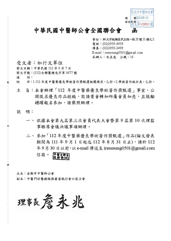 | 台北市中醫師公會 官網:http://www.tpcma.org.tw 地址:台北市中正區青島西路11號3樓 E-mail:tp.cma@msa.hinet.net 電話:(02)2314-3456(代表號) 傳真:(02)2314-8181 |