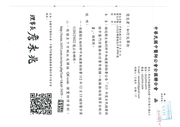 | 台北市中醫師公會 官網:http://www.tpcma.org.tw 地址:台北市中正區青島西路11號3樓 E-mail:tp.cma@msa.hinet.net 電話:(02)2314-3456(代表號) 傳真:(02)2314-8181 |