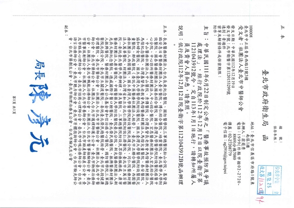 | 台北市中醫師公會 官網:http://www.tpcma.org.tw 地址:台北市中正區青島西路11號3樓 E-mail:tp.cma@msa.hinet.net 電話:(02)2314-3456(代表號) 傳真:(02)2314-8181 |