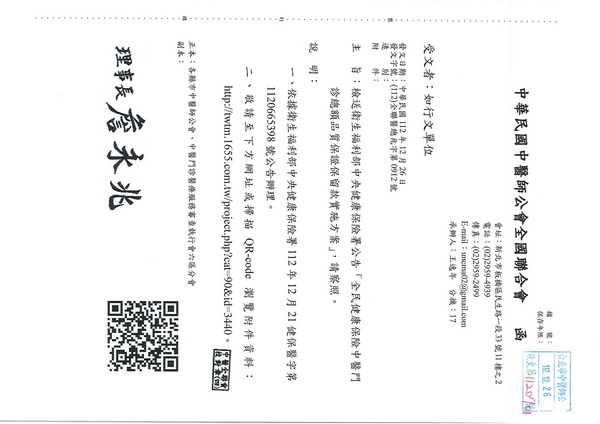 | 台北市中醫師公會 官網:http://www.tpcma.org.tw 地址:台北市中正區青島西路11號3樓 E-mail:tp.cma@msa.hinet.net 電話:(02)2314-3456(代表號) 傳真:(02)2314-8181 |