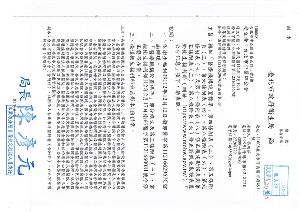 | 台北市中醫師公會 官網:http://www.tpcma.org.tw 地址:台北市中正區青島西路11號3樓 E-mail:tp.cma@msa.hinet.net 電話:(02)2314-3456(代表號) 傳真:(02)2314-8181 |