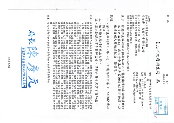 | 台北市中醫師公會 官網:http://www.tpcma.org.tw 地址:台北市中正區青島西路11號3樓 E-mail:tp.cma@msa.hinet.net 電話:(02)2314-3456(代表號) 傳真:(02)2314-8181 |