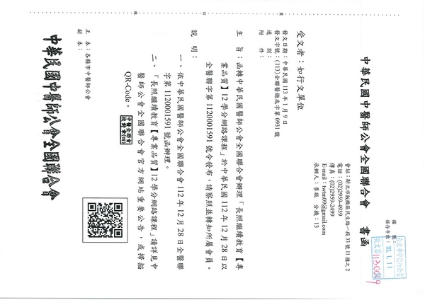 | 台北市中醫師公會 官網:http://www.tpcma.org.tw 地址:台北市中正區青島西路11號3樓 E-mail:tp.cma@msa.hinet.net 電話:(02)2314-3456(代表號) 傳真:(02)2314-8181 |