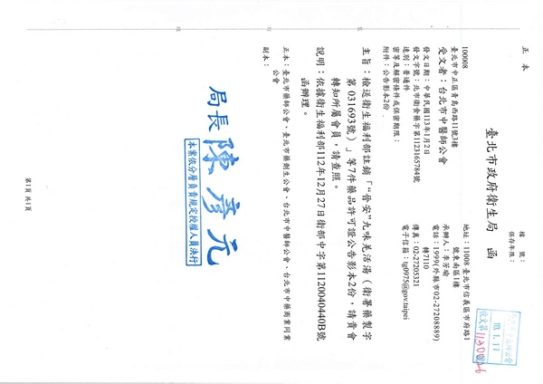 | 台北市中醫師公會 官網:http://www.tpcma.org.tw 地址:台北市中正區青島西路11號3樓 E-mail:tp.cma@msa.hinet.net 電話:(02)2314-3456(代表號) 傳真:(02)2314-8181 |