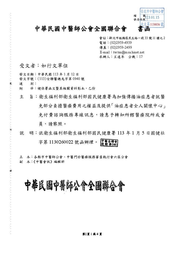 | 台北市中醫師公會 官網:http://www.tpcma.org.tw 地址:台北市中正區青島西路11號3樓 E-mail:tp.cma@msa.hinet.net 電話:(02)2314-3456(代表號) 傳真:(02)2314-8181 |