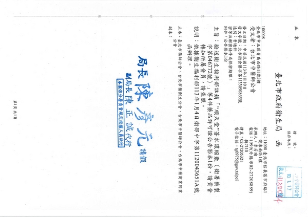 | 台北市中醫師公會 官網:http://www.tpcma.org.tw 地址:台北市中正區青島西路11號3樓 E-mail:tp.cma@msa.hinet.net 電話:(02)2314-3456(代表號) 傳真:(02)2314-8181 |