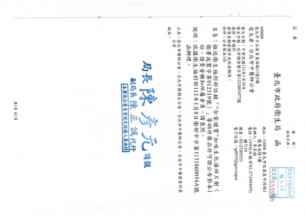 | 台北市中醫師公會 官網:http://www.tpcma.org.tw 地址:台北市中正區青島西路11號3樓 E-mail:tp.cma@msa.hinet.net 電話:(02)2314-3456(代表號) 傳真:(02)2314-8181 |