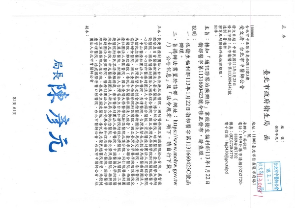 | 台北市中醫師公會 官網:http://www.tpcma.org.tw 地址:台北市中正區青島西路11號3樓 E-mail:tp.cma@msa.hinet.net 電話:(02)2314-3456(代表號) 傳真:(02)2314-8181 |