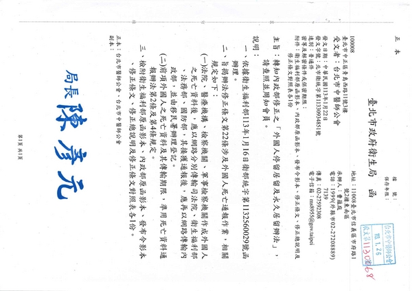 | 台北市中醫師公會 官網:http://www.tpcma.org.tw 地址:台北市中正區青島西路11號3樓 E-mail:tp.cma@msa.hinet.net 電話:(02)2314-3456(代表號) 傳真:(02)2314-8181 |
