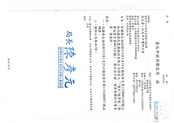 | 台北市中醫師公會 官網:http://www.tpcma.org.tw 地址:台北市中正區青島西路11號3樓 E-mail:tp.cma@msa.hinet.net 電話:(02)2314-3456(代表號) 傳真:(02)2314-8181 |