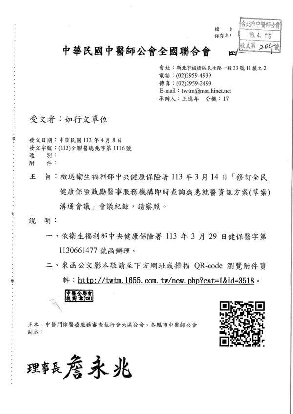 | 台北市中醫師公會 官網:http://www.tpcma.org.tw 地址:台北市中正區青島西路11號3樓 E-mail:tp.cma@msa.hinet.net 電話:(02)2314-3456(代表號) 傳真:(02)2314-8181 |
