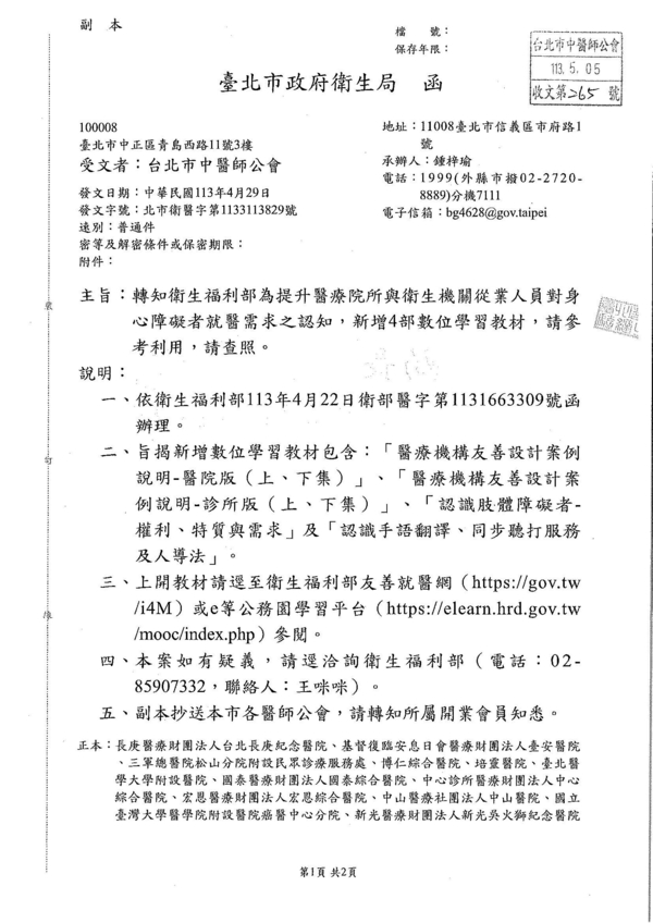 | 台北市中醫師公會 官網:http://www.tpcma.org.tw 地址:台北市中正區青島西路11號3樓 E-mail:tp.cma@msa.hinet.net 電話:(02)2314-3456(代表號) 傳真:(02)2314-8181 |