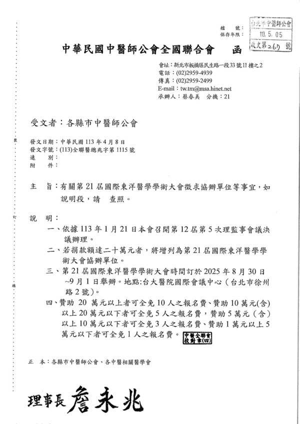 | 台北市中醫師公會 官網:http://www.tpcma.org.tw 地址:台北市中正區青島西路11號3樓 E-mail:tp.cma@msa.hinet.net 電話:(02)2314-3456(代表號) 傳真:(02)2314-8181 |