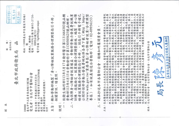 | 台北市中醫師公會 官網:http://www.tpcma.org.tw 地址:台北市中正區青島西路11號3樓 E-mail:tp.cma@msa.hinet.net 電話:(02)2314-3456(代表號) 傳真:(02)2314-8181 |