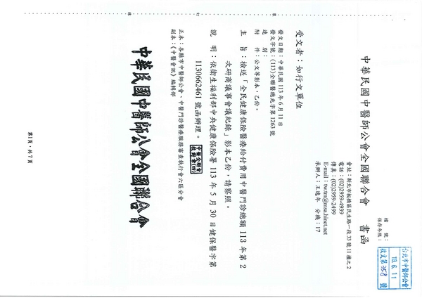 | 台北市中醫師公會 官網:http://www.tpcma.org.tw 地址:台北市中正區青島西路11號3樓 E-mail:tp.cma@msa.hinet.net 電話:(02)2314-3456(代表號) 傳真:(02)2314-8181 |