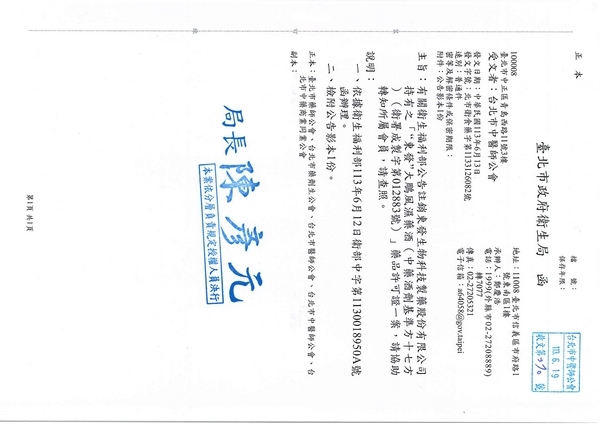 | 台北市中醫師公會 官網:http://www.tpcma.org.tw 地址:台北市中正區青島西路11號3樓 E-mail:tp.cma@msa.hinet.net 電話:(02)2314-3456(代表號) 傳真:(02)2314-8181 |