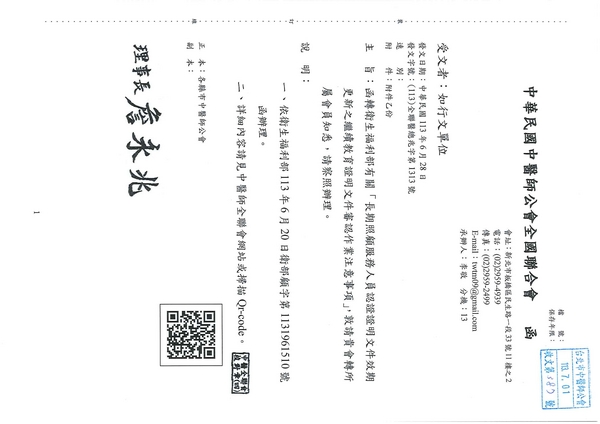 | 台北市中醫師公會 官網:http://www.tpcma.org.tw 地址:台北市中正區青島西路11號3樓 E-mail:tp.cma@msa.hinet.net 電話:(02)2314-3456(代表號) 傳真:(02)2314-8181 |