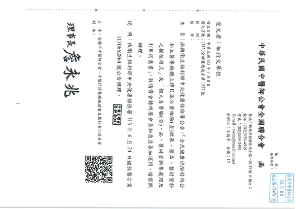 | 台北市中醫師公會 官網:http://www.tpcma.org.tw 地址:台北市中正區青島西路11號3樓 E-mail:tp.cma@msa.hinet.net 電話:(02)2314-3456(代表號) 傳真:(02)2314-8181 |