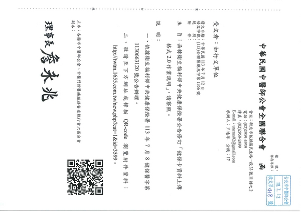 | 台北市中醫師公會 官網:http://www.tpcma.org.tw 地址:台北市中正區青島西路11號3樓 E-mail:tp.cma@msa.hinet.net 電話:(02)2314-3456(代表號) 傳真:(02)2314-8181 |