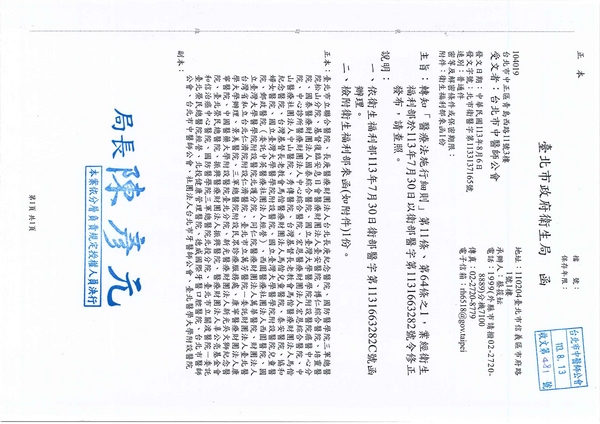 | 台北市中醫師公會 官網:http://www.tpcma.org.tw 地址:台北市中正區青島西路11號3樓 E-mail:tp.cma@msa.hinet.net 電話:(02)2314-3456(代表號) 傳真:(02)2314-8181 |