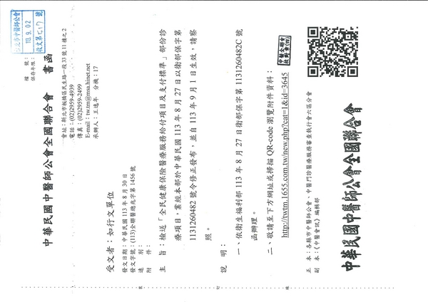 | 台北市中醫師公會 官網:http://www.tpcma.org.tw 地址:台北市中正區青島西路11號3樓 E-mail:tp.cma@msa.hinet.net 電話:(02)2314-3456(代表號) 傳真:(02)2314-8181 |