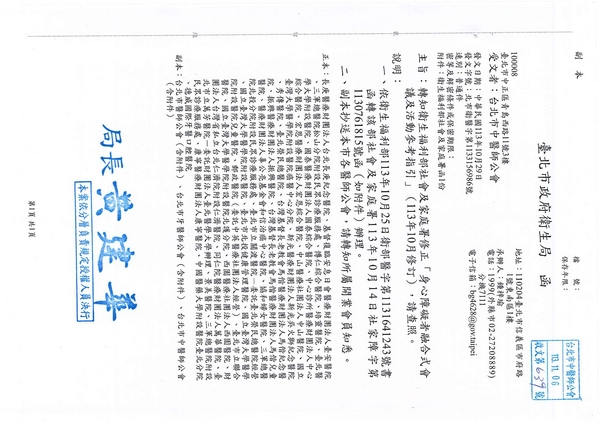 | 台北市中醫師公會 官網:http://www.tpcma.org.tw 地址:台北市中正區青島西路11號3樓 E-mail:tp.cma@msa.hinet.net 電話:(02)2314-3456(代表號) 傳真:(02)2314-8181 |