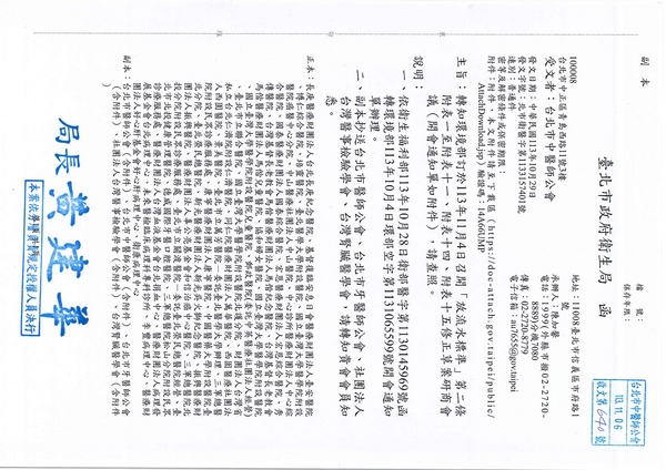 | 台北市中醫師公會 官網:http://www.tpcma.org.tw 地址:台北市中正區青島西路11號3樓 E-mail:tp.cma@msa.hinet.net 電話:(02)2314-3456(代表號) 傳真:(02)2314-8181 |