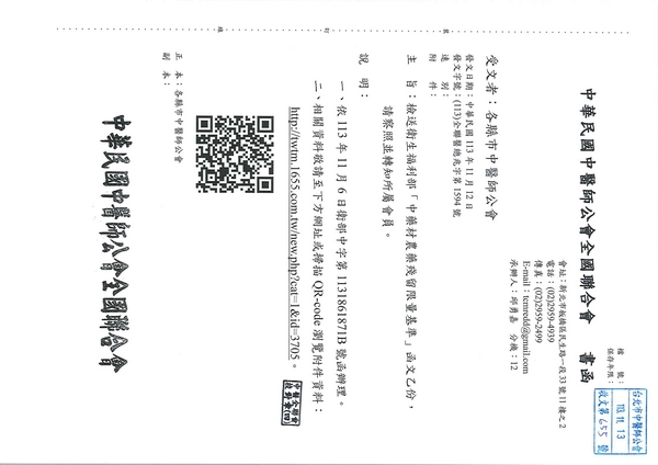 | 台北市中醫師公會 官網:http://www.tpcma.org.tw 地址:台北市中正區青島西路11號3樓 E-mail:tp.cma@msa.hinet.net 電話:(02)2314-3456(代表號) 傳真:(02)2314-8181 |